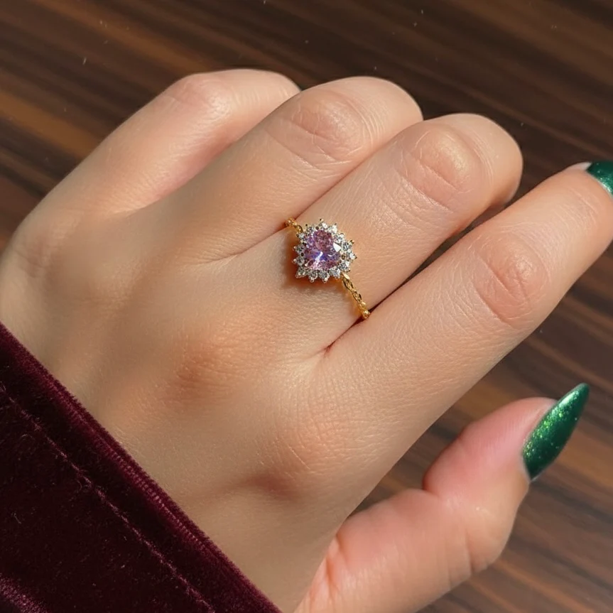 A statement piece made for modern queens. This stunning ring showcases a bold Rose pink zircon heart, crowned with a delicate halo of sparkling stones that radiate elegance from every angle.