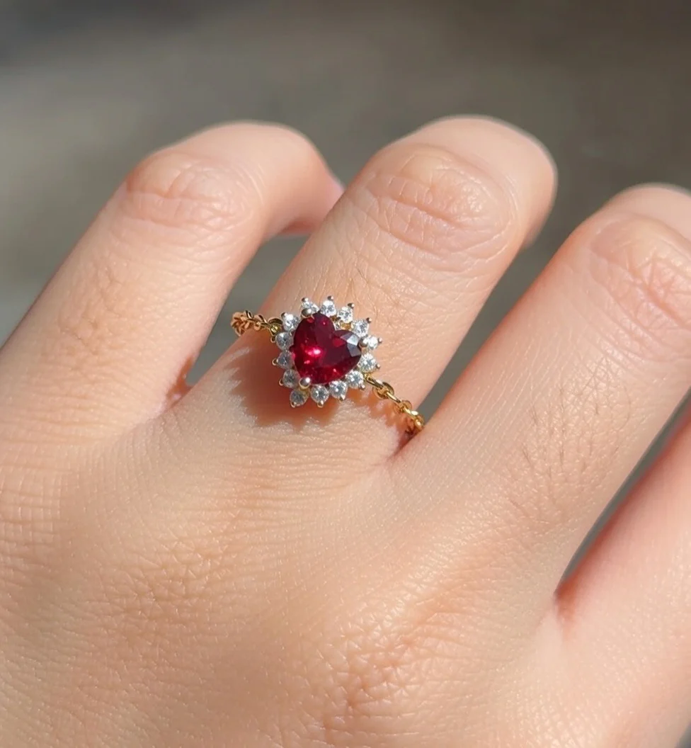 A statement piece made for modern queens. This stunning ring showcases a bold cherry-red zircon heart, crowned with a delicate halo of sparkling stones that radiate elegance from every angle.